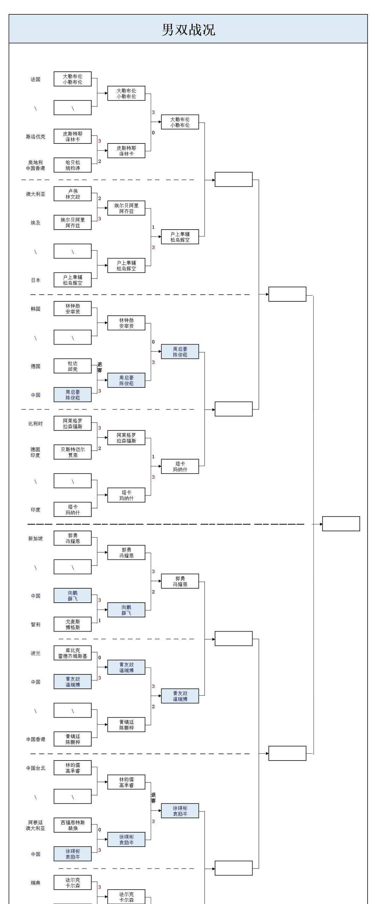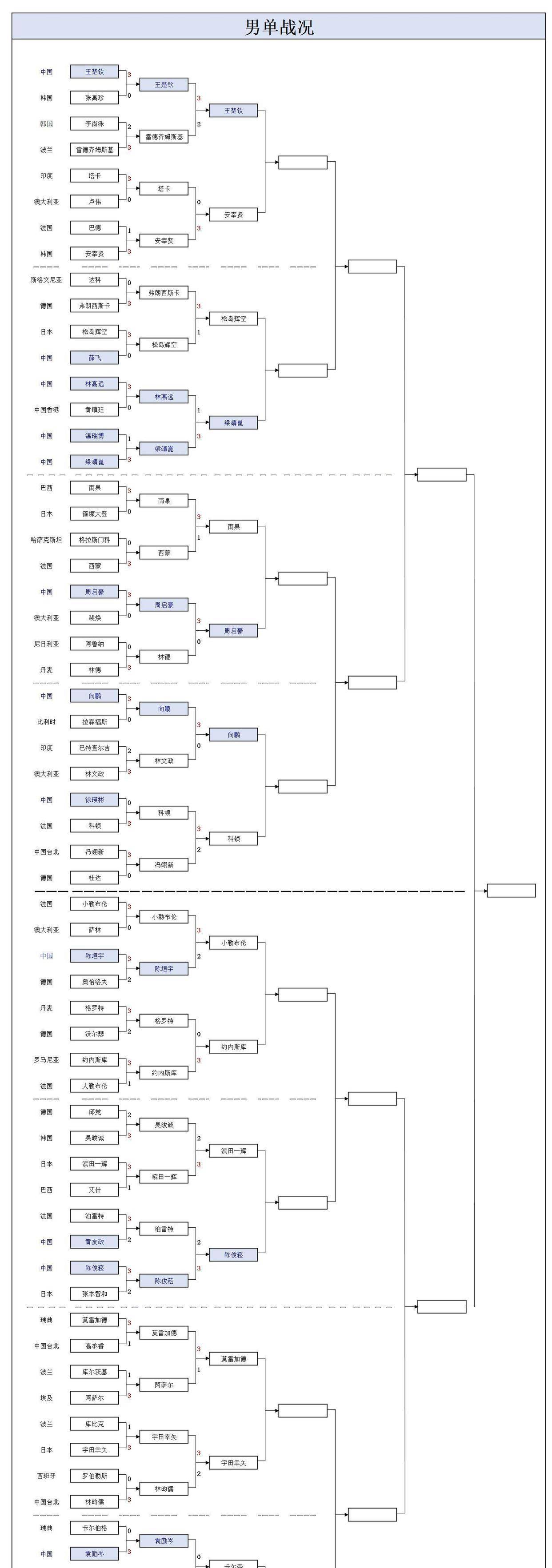 男双项目同样出现国乒德比,王楚钦与林诗栋迎战徐瑛彬和袁励岑。双打比赛讲究配合默契,不同组合之间的风格差异使得队内比赛结果往往难以预测。