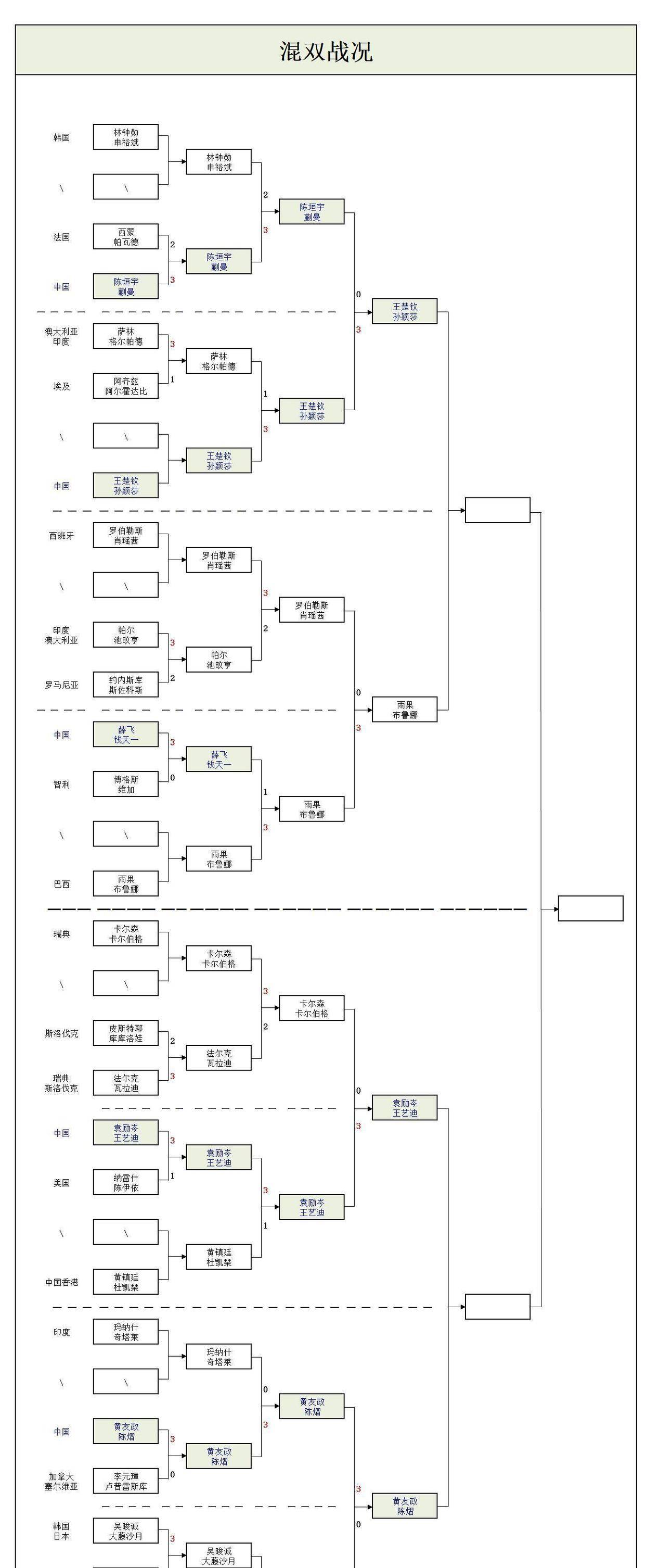 混双赛场出现国乒内战,袁励岑与王艺迪组合对阵黄友政和陈熠。这样的对阵安排确保至少一对国乒组合进入混双决赛,但也意味着有一对组合将被提前淘汰。