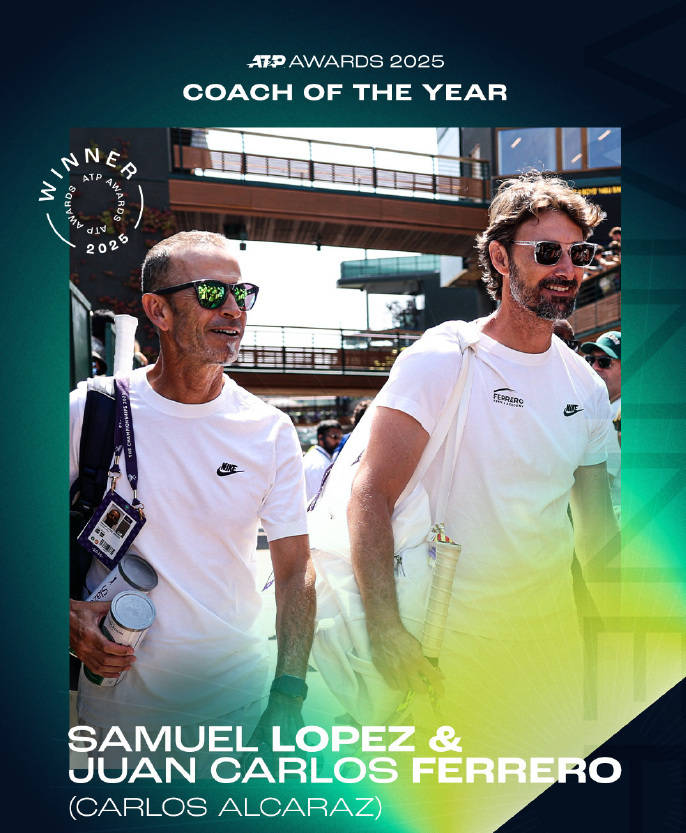 我们再来关注三条动态消息,一是北京时间今晨,ATP官宣,西班牙人阿尔卡拉斯的教练费雷罗、塞缪尔-洛佩兹荣获2025 ATP年度最佳教练奖。