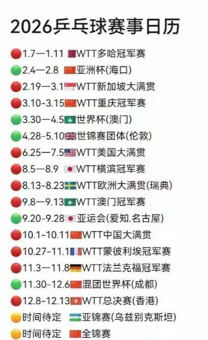 2026年的乒坛日历,简直是一张透支健康的账单:1月多哈冠军赛、2月亚洲杯、3月新加坡大满贯 重庆冠军赛、4月世界杯 伦敦世锦赛……直到12月香港总决赛,全年无缝衔接。 最致命的是9月至10月,球员刚打完名古屋亚运会,就要立刻转战WTT中国大满贯。