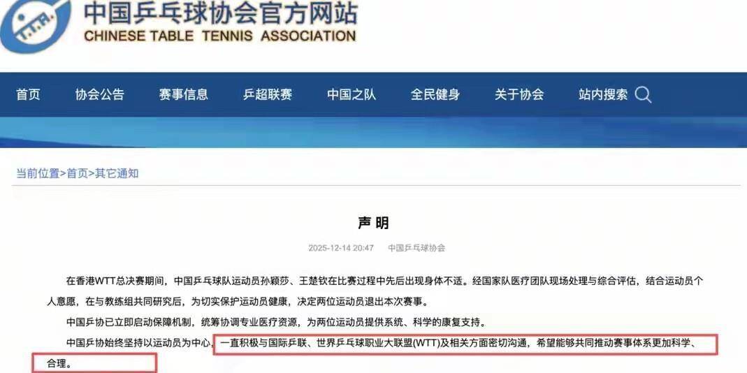 当球迷焦虑时,中国乒协在男单决赛未结束时就直接发布公告,强调“运动员健康是首要考量”,并宣布与国际乒联、WTT沟通推动赛程改革。