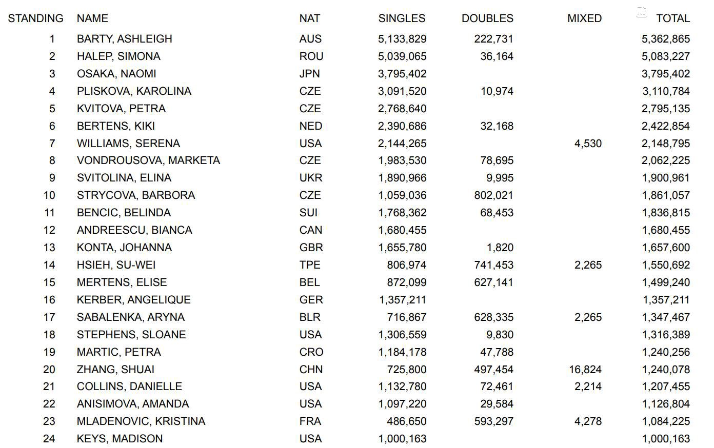 本赛季奖金突破百万的总共24位,除了前边提到的三位大满贯冠军得主之外,卡-普利斯科娃、科维托娃和贝尔滕斯、小威以及万卓索娃等在大满贯上有不错发挥的球员,也都奖金突破了200万美元。在温网打入四强的两位球员斯维托丽娜和斯特里科娃也进入到了前十当中。