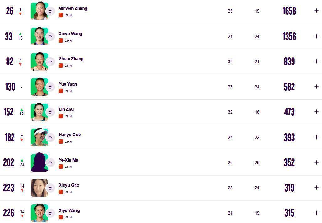 再把目光转向中国球员的榜单,这里的叙事线充满了“等待”与“前进”的变奏。 排名第26位的郑钦文,名字后面依然跟着“中国最高”的注脚,但她的排名下滑了一位。 更引人关注的是她参赛表上的空白。 自去年九月底以来,她已经连续退出了包括澳网、阿布扎比站在内的多项赛事。 WTA官方伤病报告仅显示“左腿伤势”,但具体的恢复时间表成谜。 她的社交媒体更新停留在训练视频和品牌宣传,评论区挤满了球迷的追问:“什么时候回来比赛? ” 这种不确定性,让她的排名如同悬在空中的靴子,人们不知道它还会下落多少。
