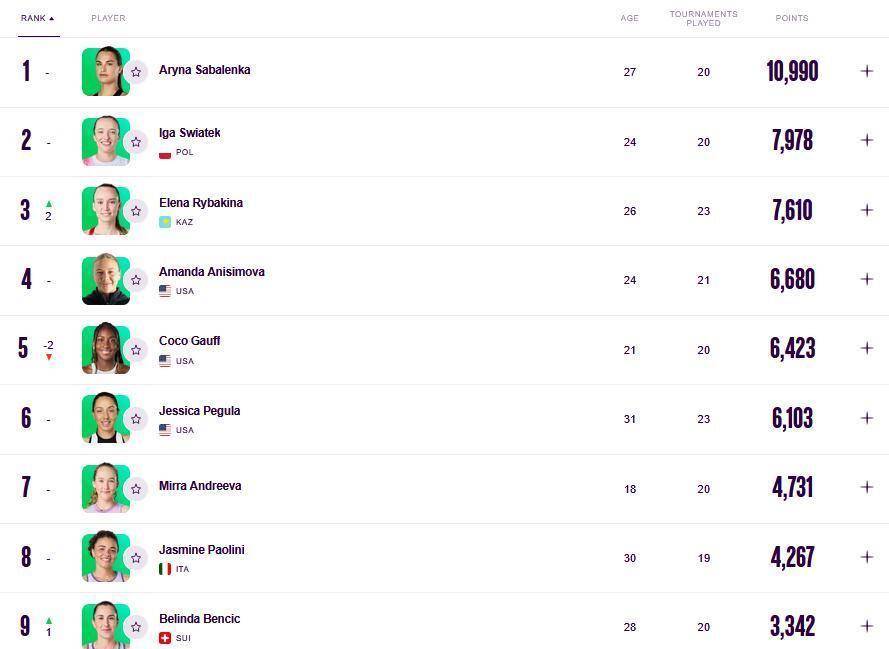 本西奇和斯维托丽娜的上升则印证了稳定性价值。 本西奇凭借产后复出后的扎实表现,从第10位微升至第9;斯维托丽娜则靠着澳网四强战绩,排名飙升2位重返前十,将去年亚军积分转化为切实的排名提升。