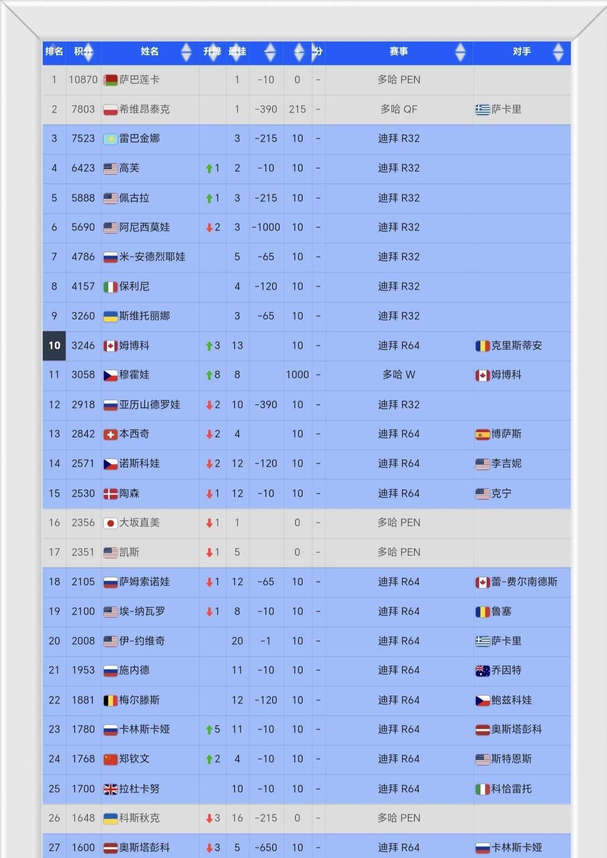 当人们的目光聚焦于新冠军和新科前十时,WTA排名榜顶端正在酝酿一场无声却激烈的风暴。 世界第一阿丽娜·萨巴伦卡虽然缺席了多哈站,但仍以10870分稳坐球后宝座,并且她也已宣布退出接下来的迪拜站。 然而,世界第二的宝座却突然变得摇摇欲坠。 波兰名将伊加·斯瓦泰克在多哈站四分之一决赛中,意外地被希腊选手玛丽亚·萨卡里以2-6, 6-4, 7-5的比分逆转淘汰。 这场失利导致斯瓦泰克的最新积分停留在7803分。 紧随其后的哈萨克斯坦名将埃琳娜·莱巴金娜,虽然同样在多哈止步八强,但积分也达到了7523分。 两人之间,仅仅相差280分。
