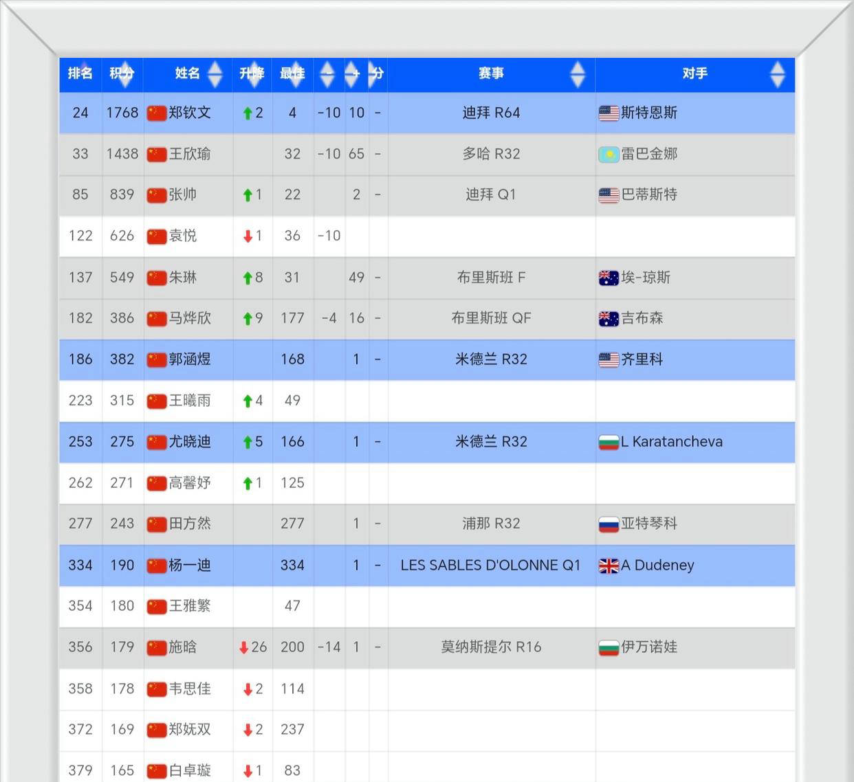 第二,聚焦中国金花:郑钦文提升两位,王欣瑜保持稳定,三人稳居TOP100 。伤病休整133天后,郑钦文状态复苏,多哈赛连胜两场挺进16强,积分增至1768分,重返第24名,较前周上升两位。本周她已启程征战迪拜1000赛,首轮遭遇美国劲敌斯特恩斯,此战也成为她争取更高排名的重要契机。数据显示,如若郑钦文一路过关斩将夺冠,有望强势冲击前15的好成绩,虽挑战不小。同期,王欣瑜排名维持第33位未有变动,仍止步个人最高排名,为未能突破33名令其粉丝略感失望。此外,中国队中另一名前百名选手为经验丰富的张帅,位列第85,可惜她在迪拜资格赛首轮被美国选手巴蒂斯特淘汰,丧失进一步提升排名的机会。其余中国选手表现也在持续观察中。