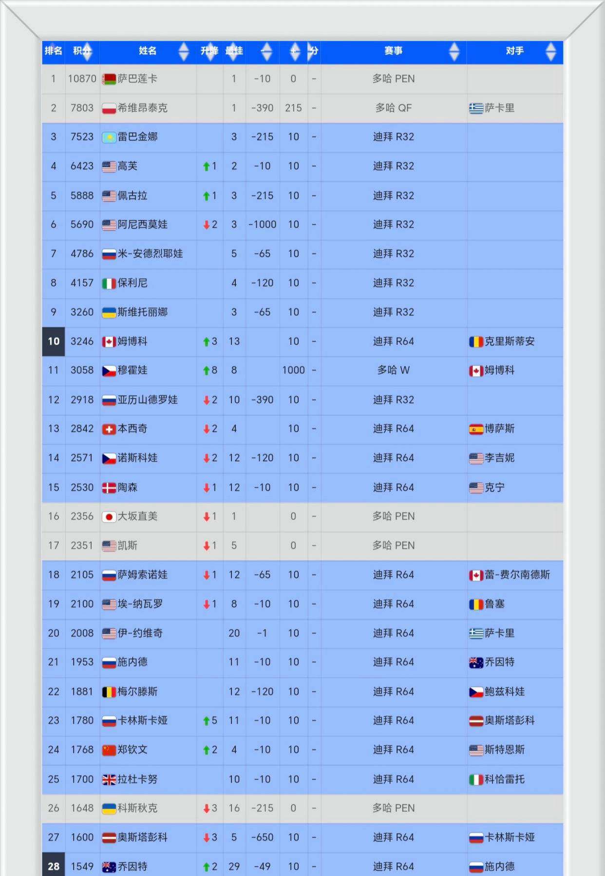 第一,前十名阵容焕新颜:19岁小将,莱巴金娜虎视眈眈挑战第二宝座,斯瓦泰克位置摇摇欲坠。即使未参加多哈站,现役世界第一萨巴伦卡依旧稳固头名,拥有10870积分且是唯一积分破万的选手。尽管白俄罗斯这位“虎妞”也退出了迪拜1000赛的争夺短期内积分难有增长,但其世界第一的位置基本不可撼动。反观波兰名将、前任世界第一斯瓦泰克,目前仅积7803分,其第二名优势岌岌可危,仅领先第三名莱巴金娜280积分。斯瓦泰克选择退出迪拜比赛,而莱巴金娜将作为头号种子参赛,只要打入半决赛便有机会登顶世界第二。排名变化方面,本周唯一跌出前十的是俄罗斯选手亚历山德罗娃,从第10降至第12,空位由加拿大小将姆博科占据,她凭借多哈站的亚军成绩上升3位进入前十,刷新个人最佳排名。多哈冠军穆霍娃目前以3058分紧随其后,排名第11,距离重返前十仅一步之遥,这位捷克将领此前最高排名曾达第8。