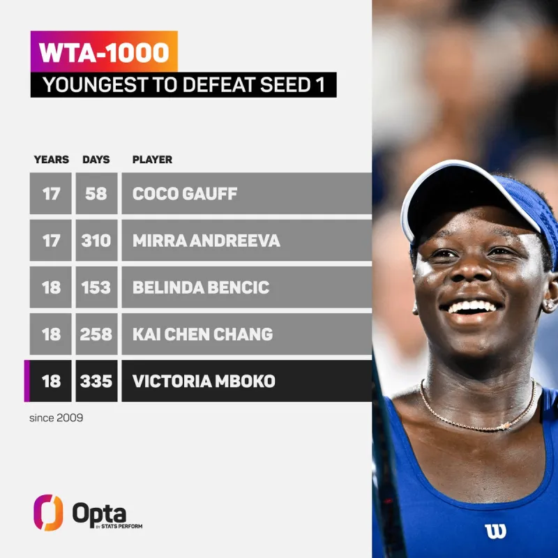 据统计,自2009年WTA引入1000赛事赛制以来,姆博科是击败头号种子选手第五年轻的球员,最年轻的是高芙。