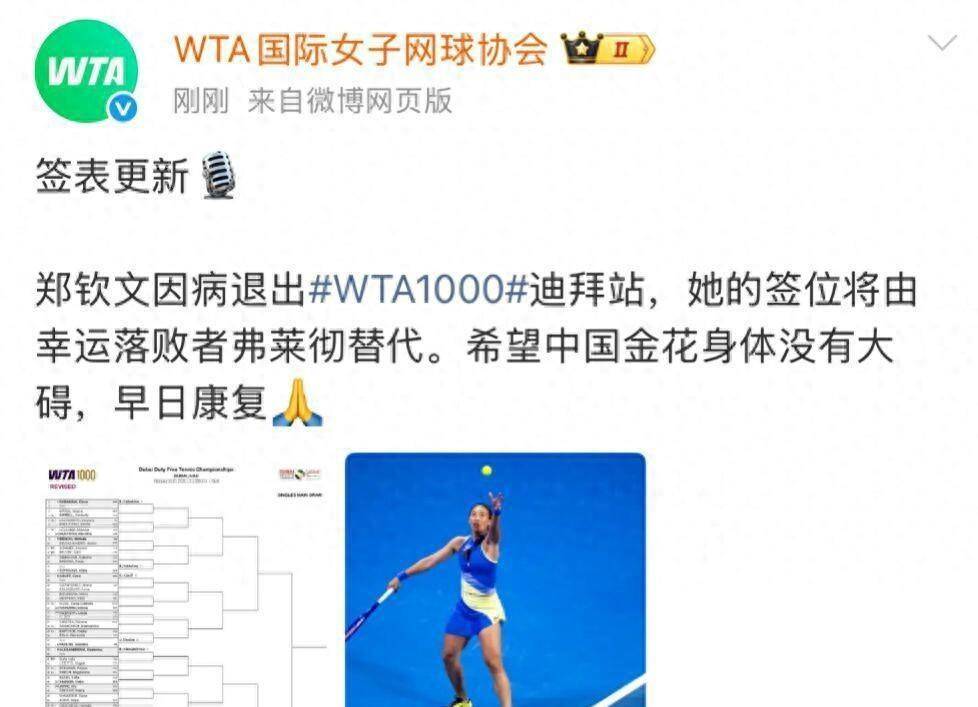 WTA巡回赛,女子网球,WTA排名,WTA赛程,女单四大满贯,女子网球直播/聚焦2025 WTA女子网球巡回赛,涵盖四大满贯、WTA1000/500/250赛事的赛程、排名、战报及竞猜推荐,为中文网球爱好者带来一站式资讯导航。好家伙,正等着看郑钦文对阵斯特恩斯的这场复仇战呢,手机弹窗突然跳出个消息! 北京时间2月15日下午,WTA官方发布通告,中国金花郑钦文因病退出WTA1000迪拜站的争夺。 她原本应在中心球场亮相,如今签位已由幸运落败者弗莱彻顶替。 说实话,看到这消息心里咯噔一下。