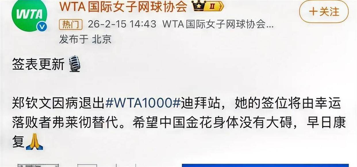 WTA巡回赛,女子网球,WTA排名,WTA赛程,女单四大满贯,女子网球直播/聚焦2025 WTA女子网球巡回赛,涵盖四大满贯、WTA1000/500/250赛事的赛程、排名、战报及竞猜推荐,为中文网球爱好者带来一站式资讯导航。就在今天凌晨,中国网球一姐郑钦文的名字再次出现在WTA的退赛公告里。 距离她伤愈复出、在多哈站打完三场荡气回肠的比赛仅仅过去一周,原定于北京时间2月15日下午4点30分在迪拜站对阵美国选手斯特恩斯的比赛,在开赛前几个小时被正式取消。 她的签位由幸运落败者弗莱彻替代。 这已经是郑钦文在2026赛季的第三次退赛。