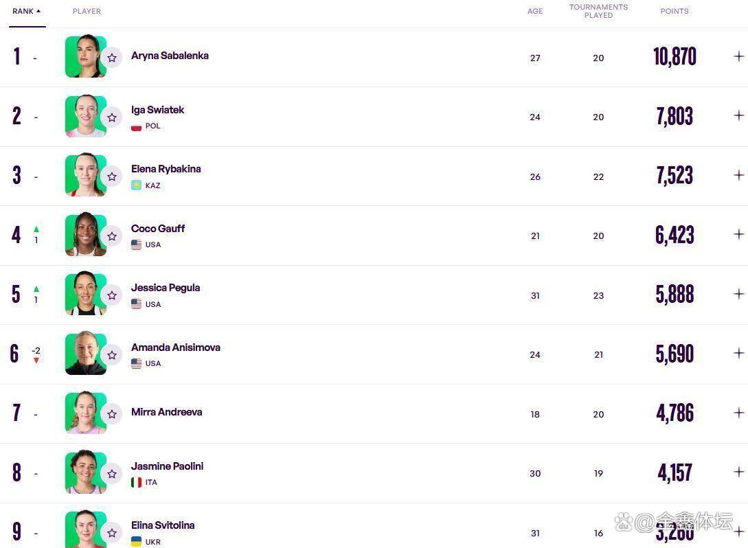 尽管多哈站冷门迭出,但女子网坛的顶尖集团依然稳固。白俄罗斯名将阿丽娜·萨巴伦卡仍然以10870分高居榜首,领先优势明显。波兰前世界第一伊加·斯瓦泰克以7803分位居第二。哈萨克斯坦猛女埃琳娜·莱巴金娜以7523分排在第三。值得注意的是,斯瓦泰克和莱巴金娜之间的积分差距只有280分。由于斯瓦泰克退出了迪拜站的比赛,莱巴金娜只要在迪拜站打入半决赛,就将在积分上反超斯瓦泰克,首次登顶世界第二。