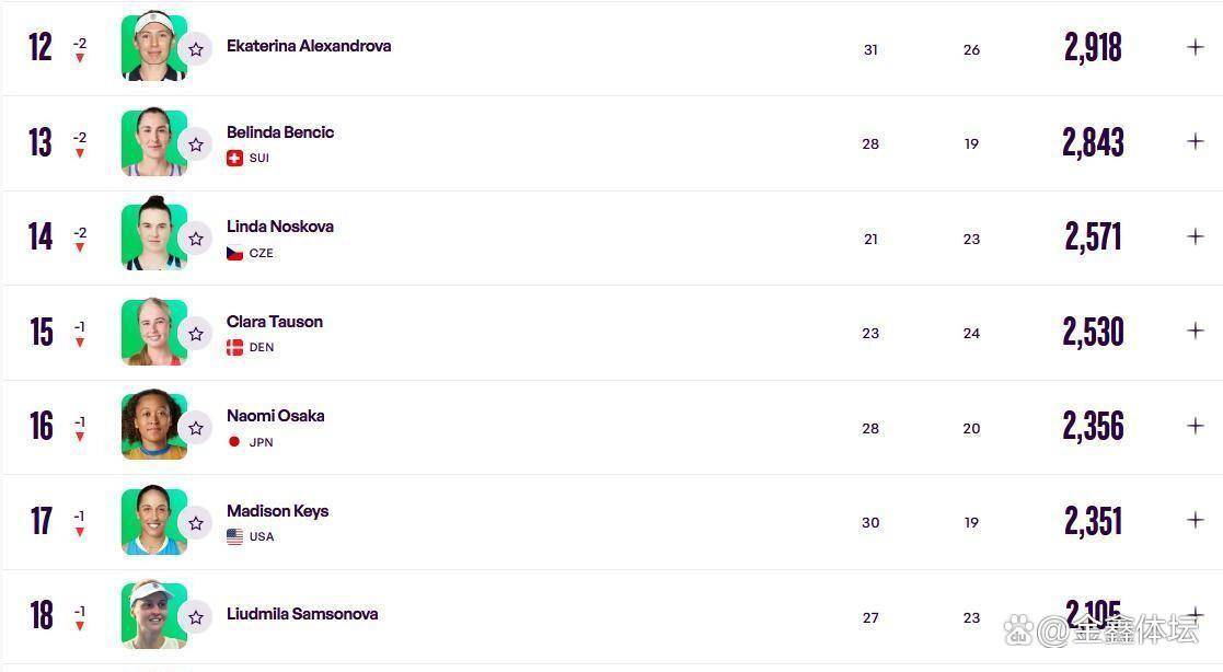 多哈站的战果,无疑对中段排名的冲击巨大,从第12位到第19位的球员,排名全部出现了变化。而其他中国金花的排名则相对稳定,王欣瑜依然排在第33位,张帅位列第85位,袁悦和朱琳等人的排名也基本保持稳定。