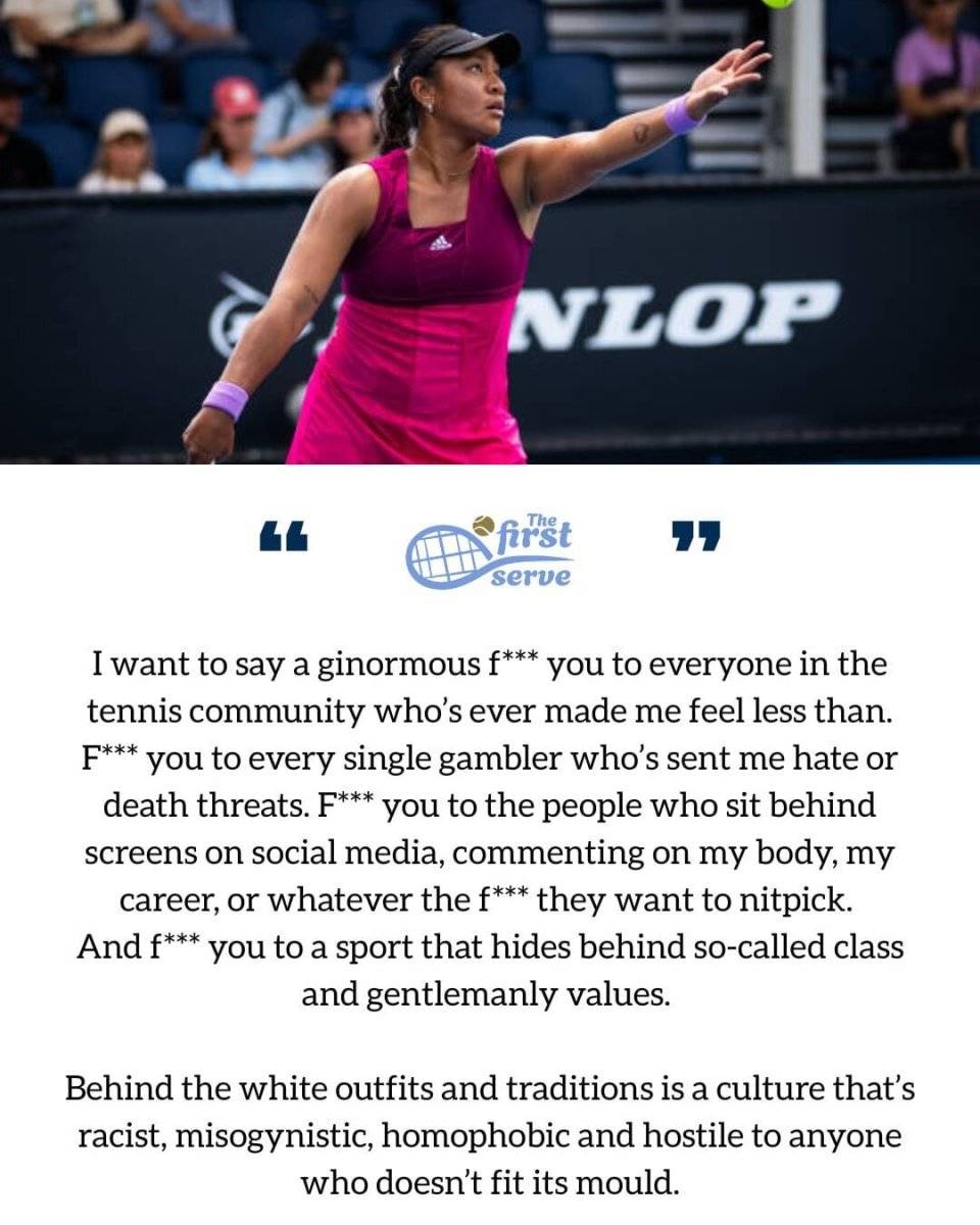 我想对网球界每一个曾让我觉得自己低人一等的人说一句超级大的“去你X的”。在白色球衣和传统背后,隐藏着一种对任何不符合其模式的人充满着种族主义、厌女、恐同且敌意的文化。